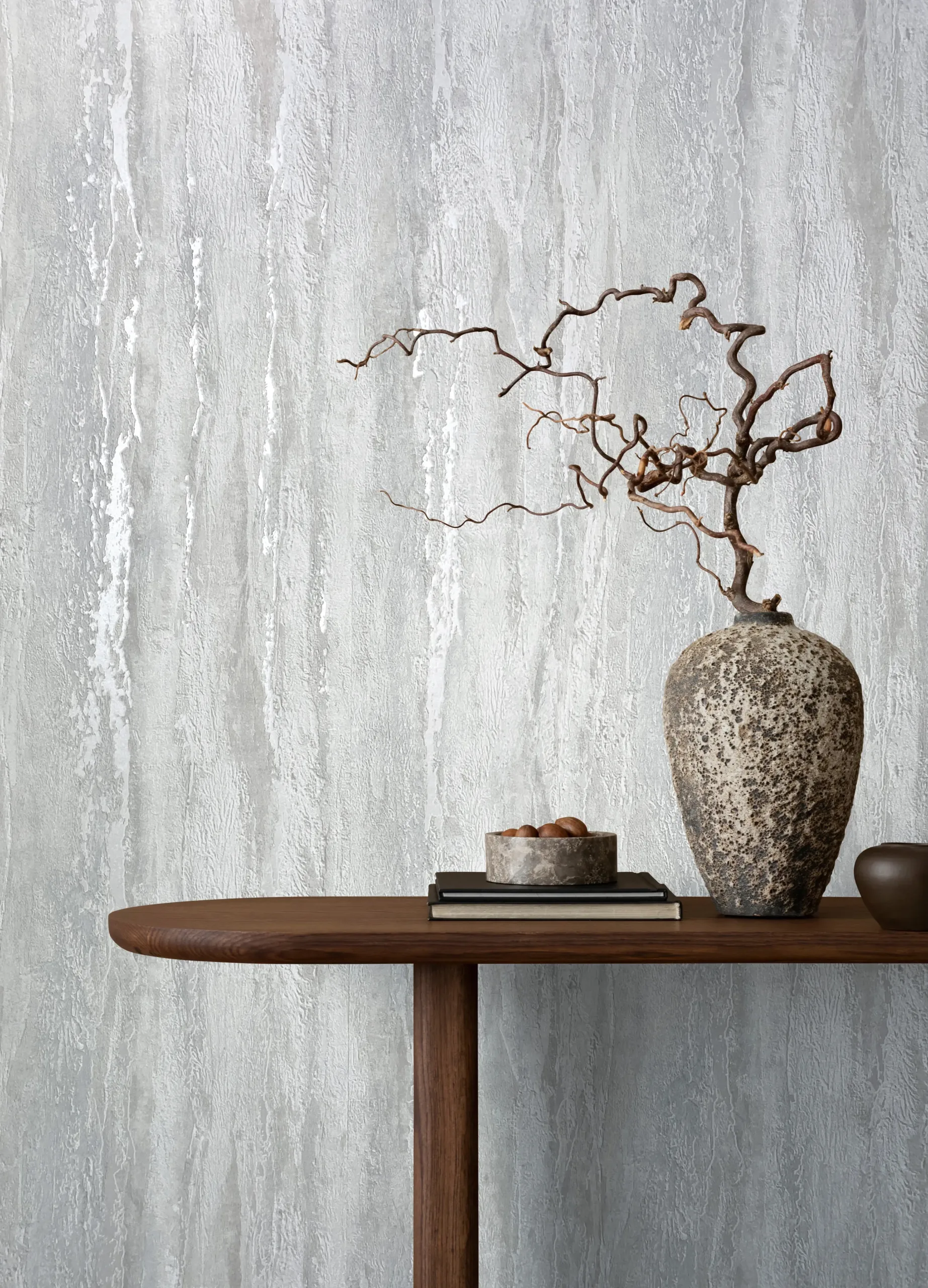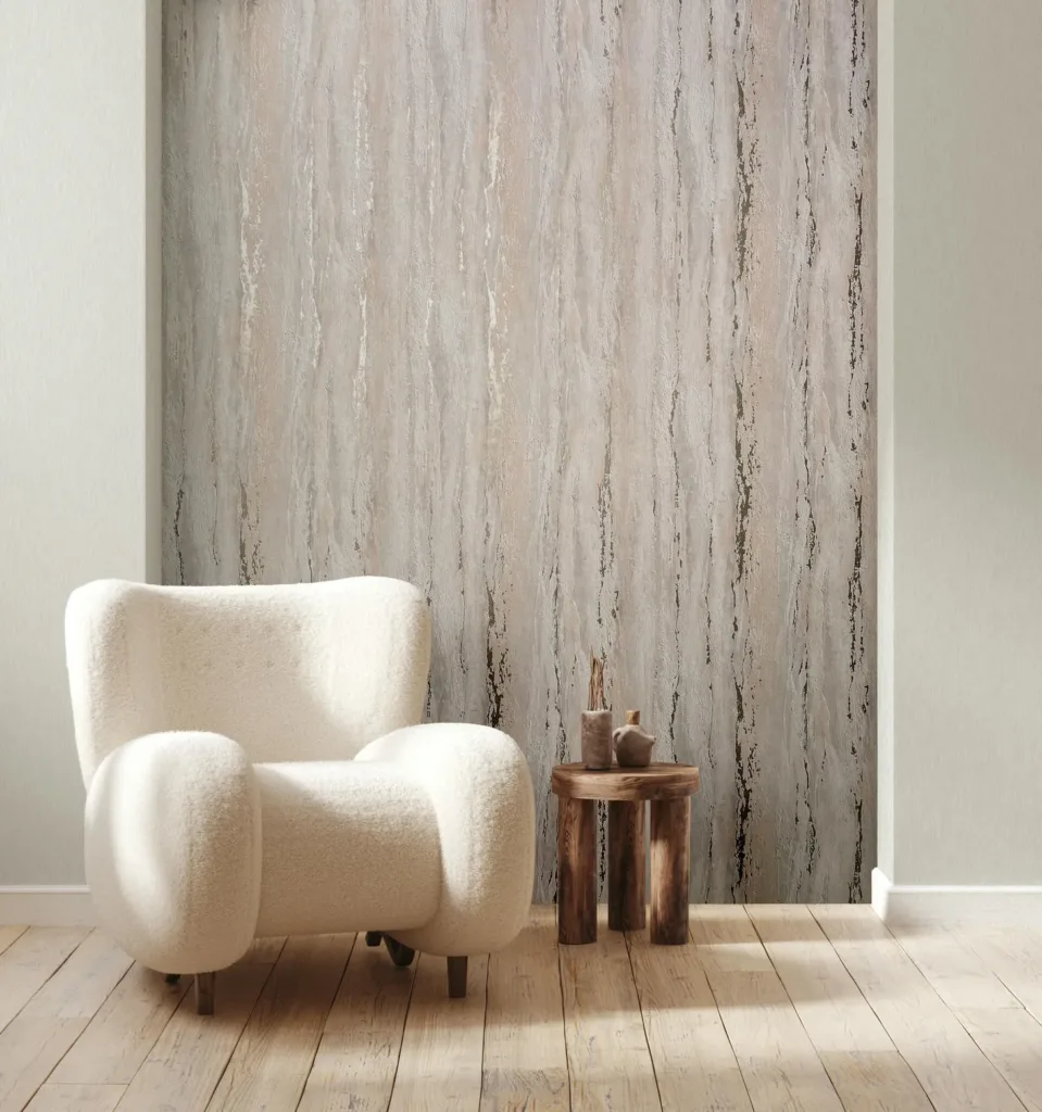 Diese Tapete präsentiert eine ausdrucksstarke, vertikal verlaufende Struktur, die an naturbelassenen Fels oder verwitterten Putz erinnert. Die reliefartige Oberfläche in sanften Sand-, Creme- und Grautönen verleiht Wänden eine natürliche Tiefe und eine organische Haptik – perfekt für ein warmes, erdverbundenes Ambiente mit rustikal-modernem Charakter.