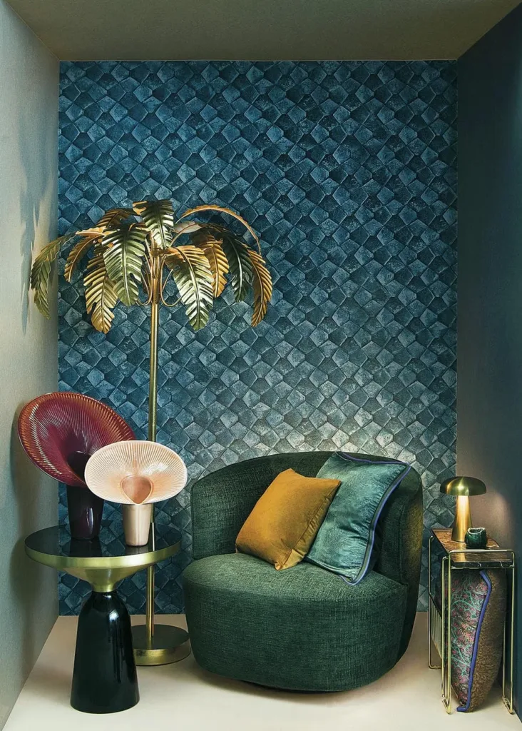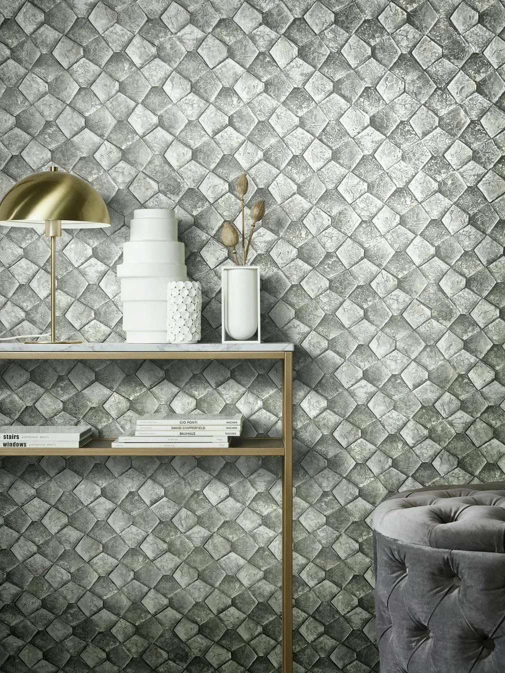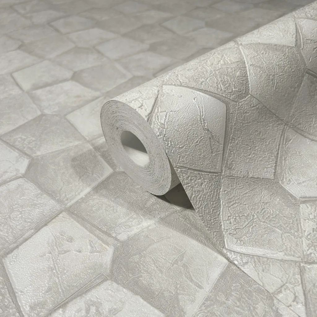 Diese Tapete vereint geometrische Präzision mit natürlicher Steinoptik: Das reliefartige Rautenmuster erzeugt einen spannenden 3D-Effekt, der an mosaikartige Fliesen erinnert. Die fein marmorierte Struktur in hellen Grautönen verleiht der Oberfläche eine edle Tiefe – ideal für moderne Raumkonzepte mit architektonischem Anspruch und mineralischer Eleganz.