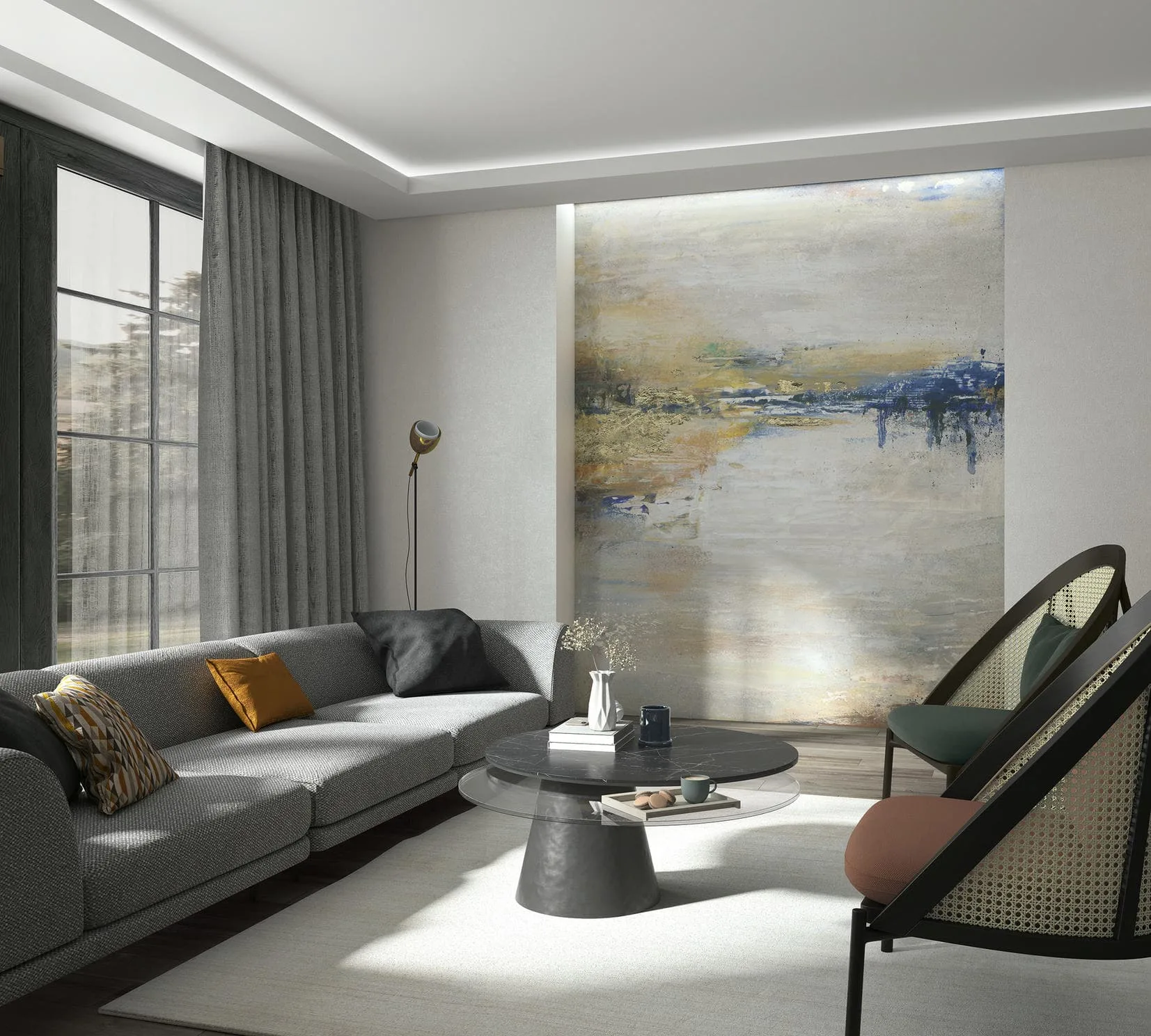 Dieses ausdrucksstarke Wandbild vereint Kunst und Emotion auf eindrucksvolle Weise: Ein geheimnisvolles Gesicht schimmert durch neblige Blautöne und trifft auf eine goldene Horizontlinie, die wie Sonnenlicht über Wasser fließt. Eine faszinierende Komposition, die Tiefe, Sehnsucht und künstlerische Kraft in Ihren Raum bringt.