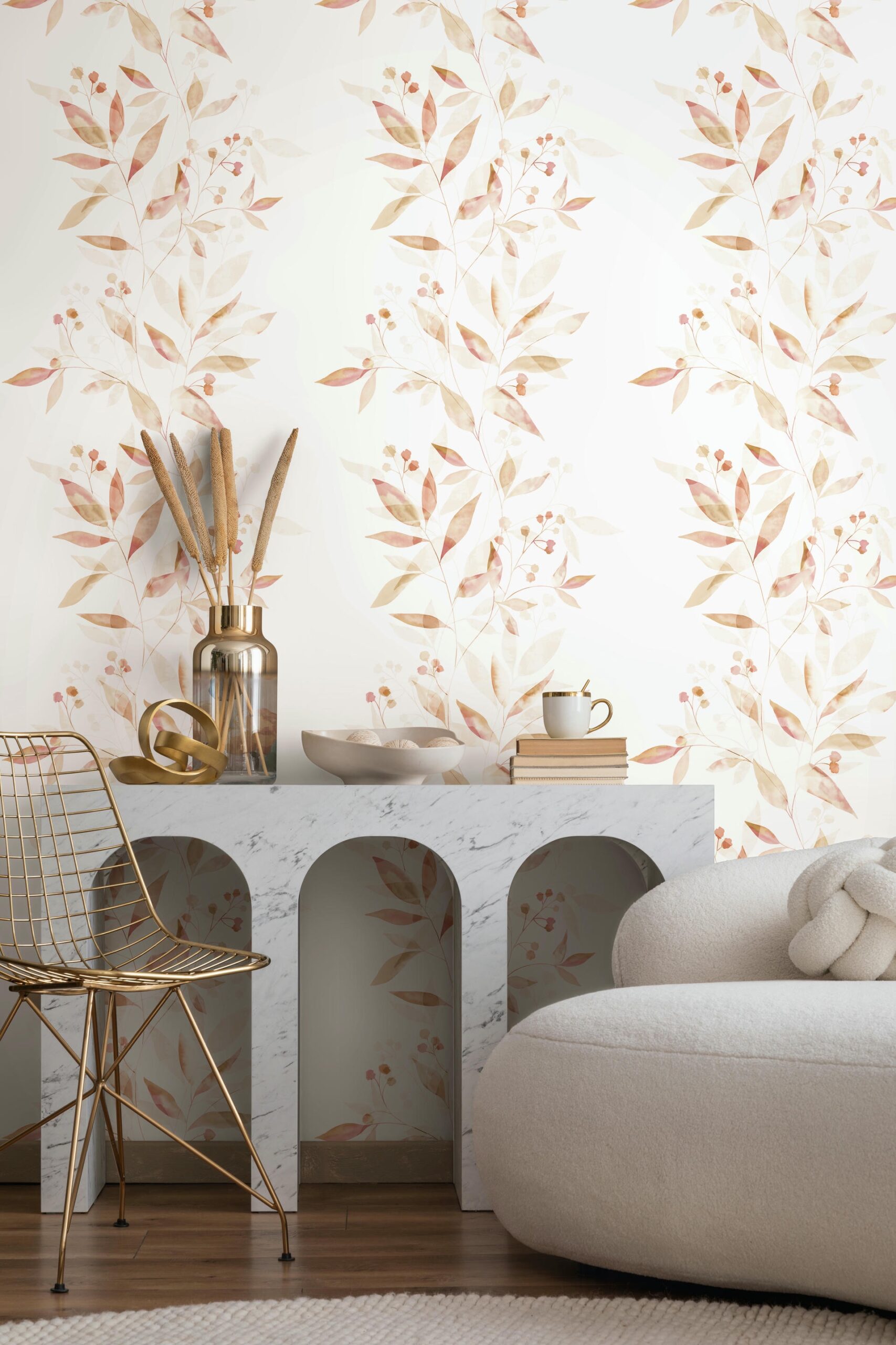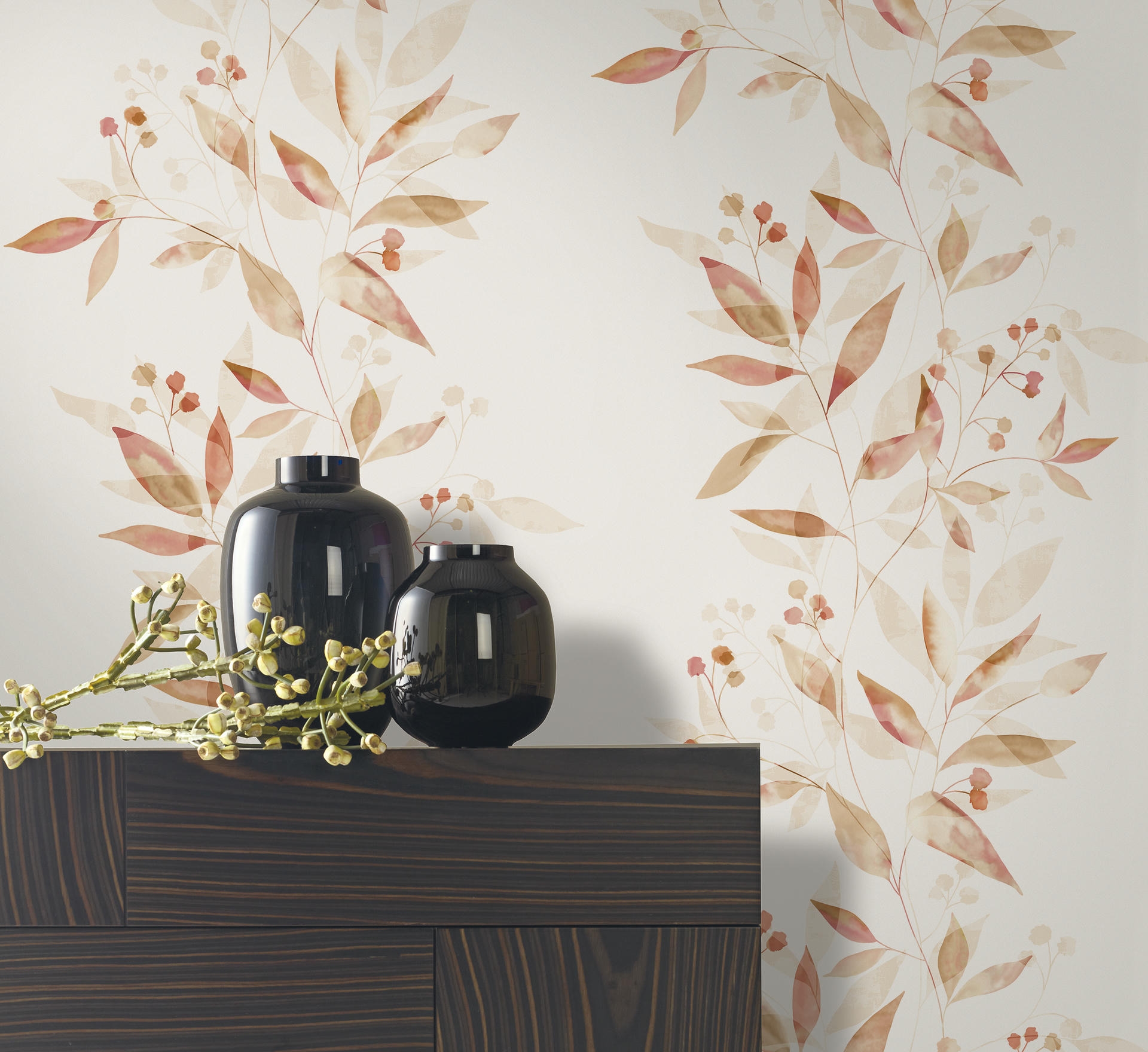 Unregelmäßig und unkompliziert: Die lebendige Dynamik des rankenden Blattmotivs passt zu modernen wie klassischen Einrichtungen. Da die Tapete ansatzfrei ist, lassen sich die Bahnen intuitiv aneinanderfügen – für eine durchgängig harmonische Wandgestaltung.