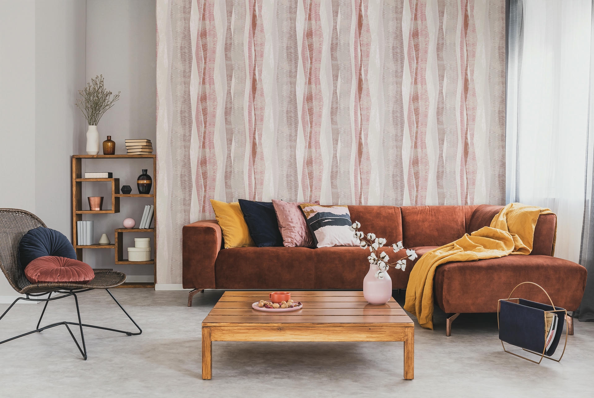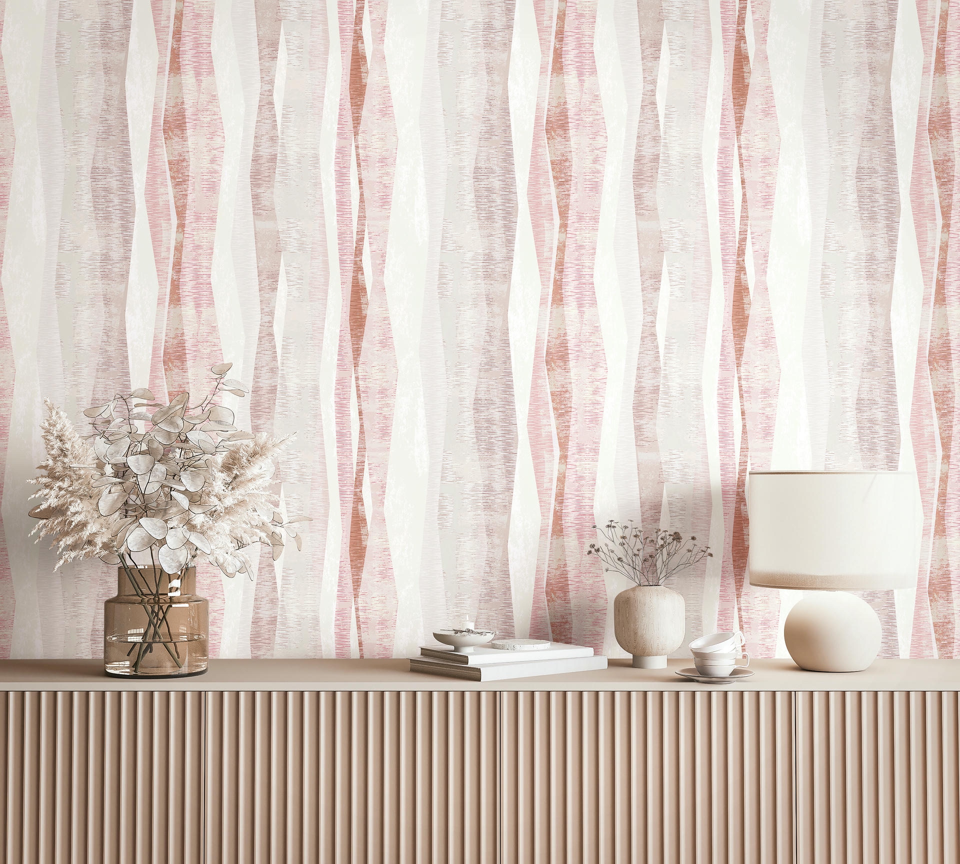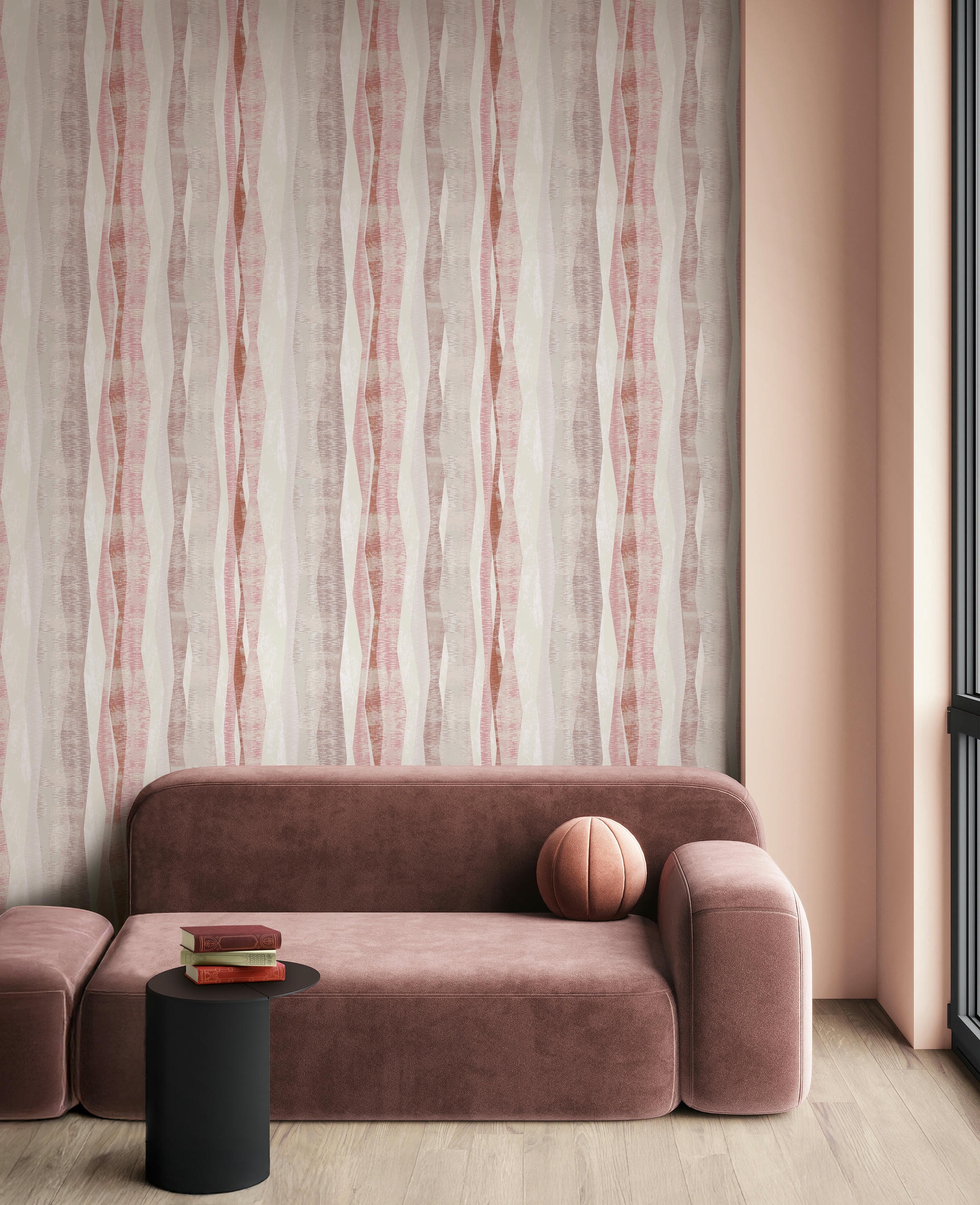 Weich, rhythmisch, modern: Das Dessin spielt mit transparenten Farbschichten und schwungvollen Linien. Ideal für Räume mit grafischem Anspruch und entspannter Atmosphäre.