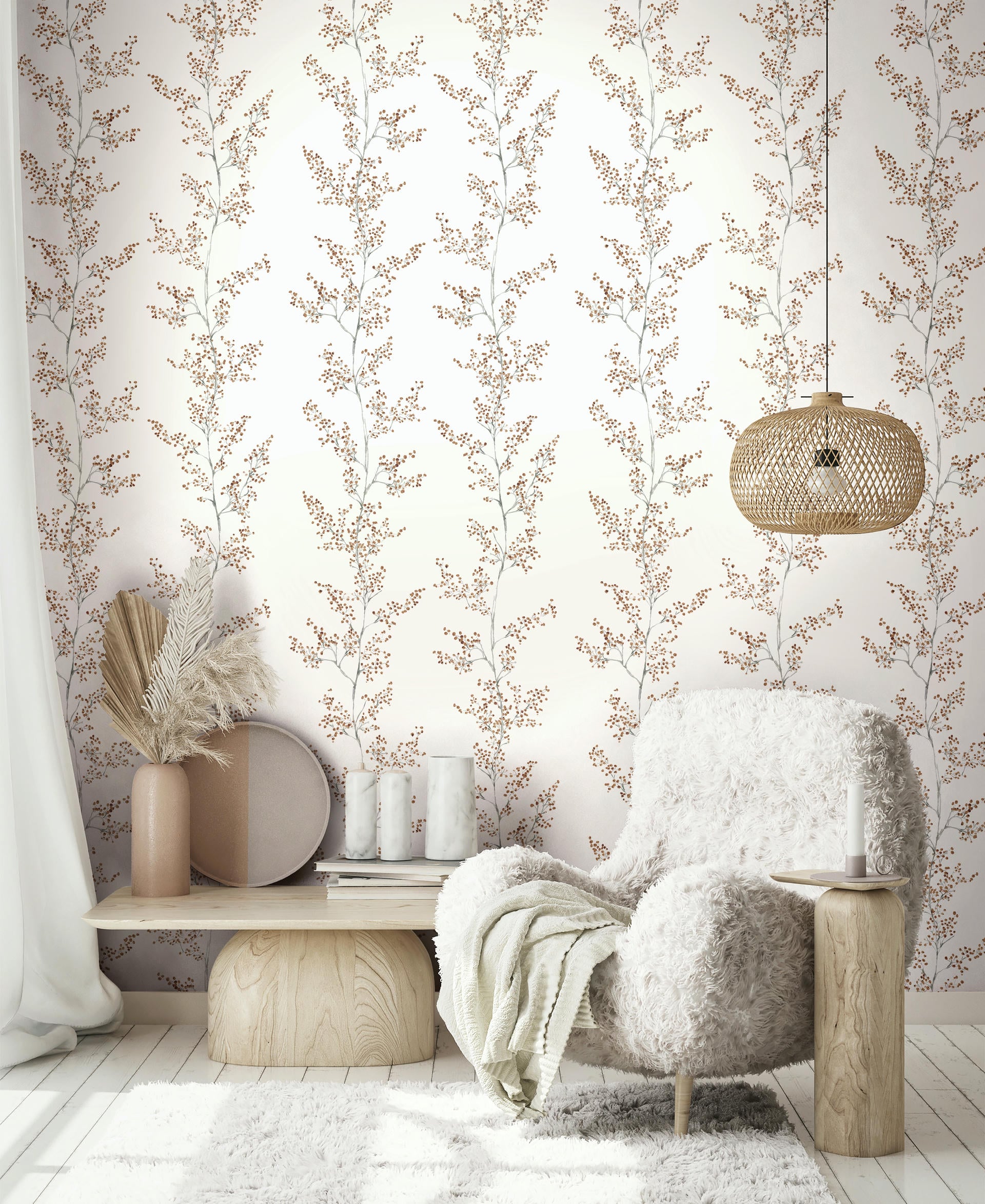 Klarer Aufbau, verspielte Wirkung: Feine Zweige mit kleinen Knospen ranken sich rhythmisch nach oben. Das ansatzfreie Muster ermöglicht ein müheloses Nebeneinander der Bahnen. Die Farbpalette reicht von zart bis kraftvoll – für individuelle Gestaltung mit Charakter.